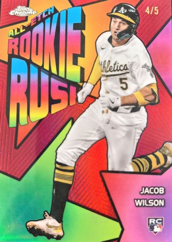 The Jacob Wilson 2025 Topps Chrome #CERR-6 All-Etch Rookie Rush - Red Refractor /5 card in Raw condition has not changed in price in the last 30 days and was last sold for $168.49 .
