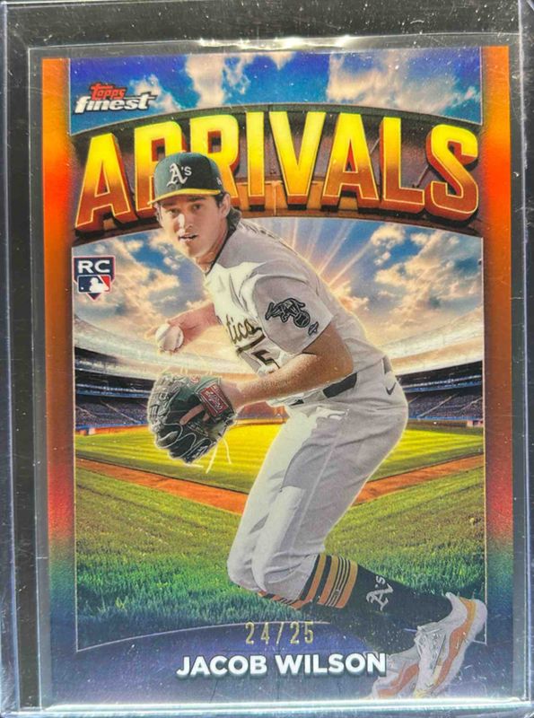 The Jacob Wilson 2025 Topps Finest #A-5 Arrivals - Orange Refractor /25 Rookie card is 1 of 157 Jacob Wilson's card variations in the 2025 Topps Finest set being tracked by Sports Card Investor, including Common, Rare, Uncommon, Common - Checkerboard Refractor, and Common - Refractor.