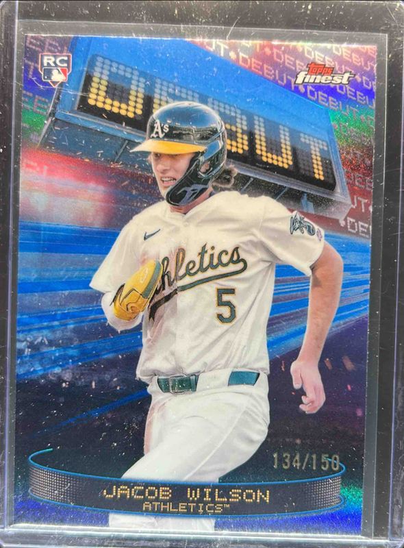 The Jacob Wilson 2025 Topps Finest #D-6 Debut - Sky Blue Refractor /150 Rookie card is 1 of 157 Jacob Wilson's card variations in the 2025 Topps Finest set being tracked by Sports Card Investor, including Common, Rare, Uncommon, Common - Checkerboard Refractor, and Common - Refractor.