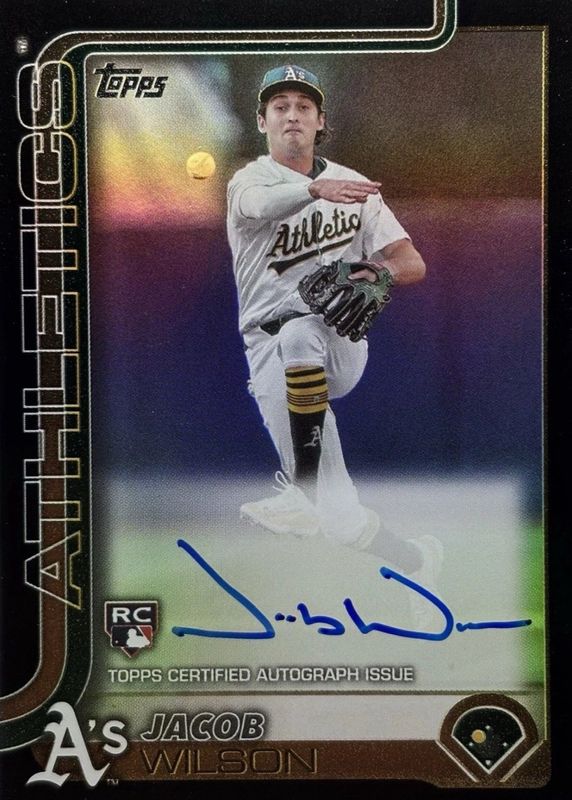 The Jacob Wilson 2025 Topps #314 Flagship Real One Autographs - Black Foil /10 Rookie card in Raw condition has not changed in price in the last 30 days and was last sold for $1,249.99 .