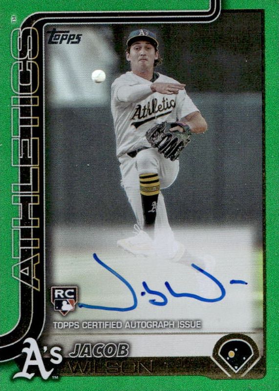 The Jacob Wilson 2025 Topps #314 Flagship Real One Autographs - Green Foil /99 Rookie card in Raw condition has not changed in price in the last 30 days and was last sold for $67.41 .