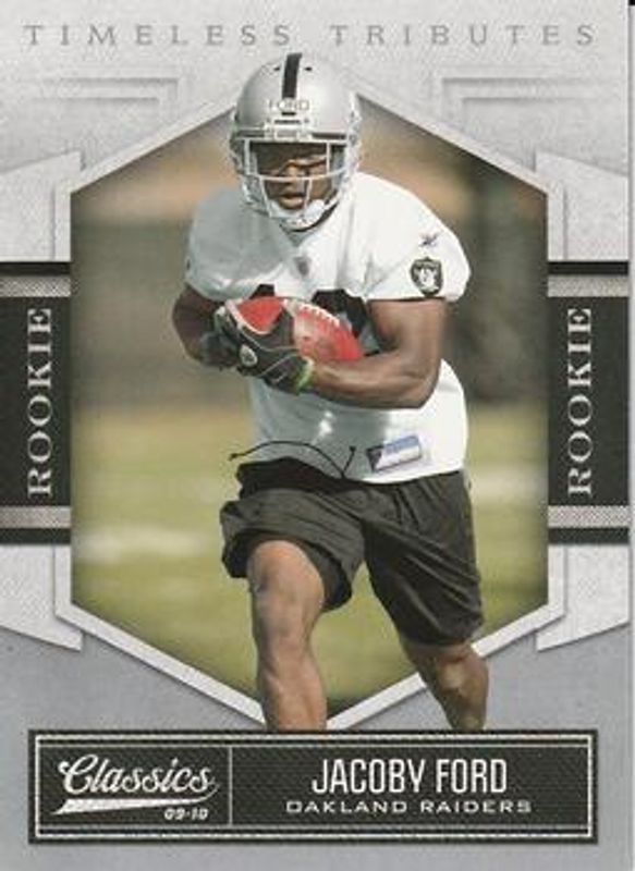 The Jacoby Ford 2010 Classics #146 Timeless Tributes Silver /100 Rookie card is 1 of 6 Jacoby Ford's card variations in the 2010 Classics set being tracked by Sports Card Investor, including Base /999, Timeless Tributes Gold /50, Timeless Tributes Platinum /25, Significant Signatures - Gold /99, and Significant Signatures - Platinum /25.