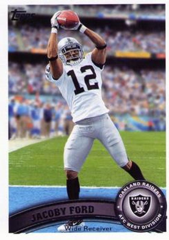 The Jacoby Ford 2011 Topps #312 Base card is 1 of 9 Jacoby Ford's card variations in the 2011 Topps set being tracked by Sports Card Investor, including Gold /2011, Red /77, Black /55, Platinum /1, and Printing Plates Black /1.