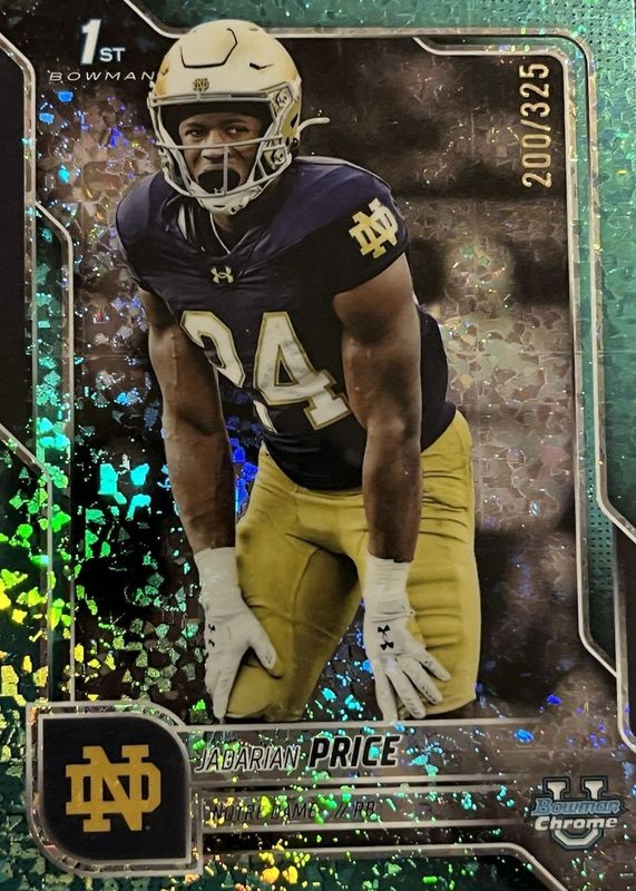 This card is 1 of 54 Jadarian Price's card variations in the 2025 Bowman Chrome University set being tracked by Sports Card Investor, including Base (1st), Pink Lava Refractor (1st), Refractor (1st), Shimmer Refractor (1st), and Stealth Refractor (1st).