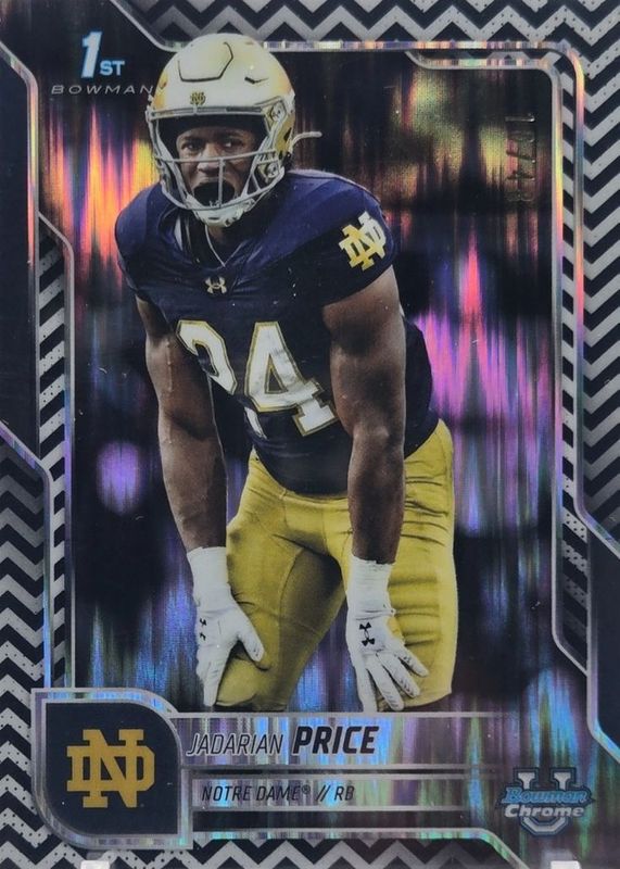 This card is 1 of 54 Jadarian Price's card variations in the 2025 Bowman Chrome University set being tracked by Sports Card Investor, including Base (1st), Pink Lava Refractor (1st), Refractor (1st), Shimmer Refractor (1st), and Stealth Refractor (1st).