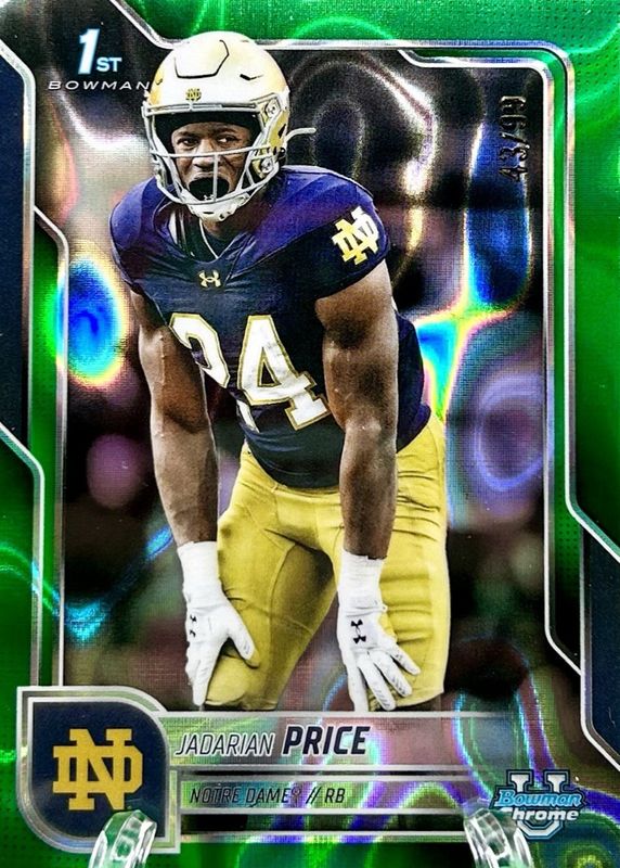 This card is 1 of 54 Jadarian Price's card variations in the 2025 Bowman Chrome University set being tracked by Sports Card Investor, including Base (1st), Pink Lava Refractor (1st), Refractor (1st), Shimmer Refractor (1st), and Stealth Refractor (1st).