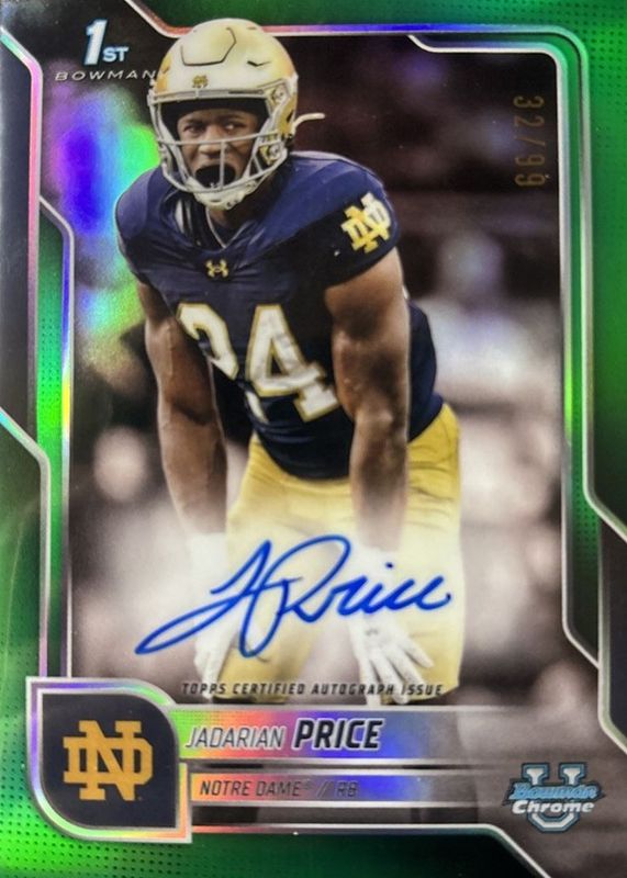 Jadarian Price 2025 Bowman Chrome U 1st True Green Auto /99 Notre Dame!