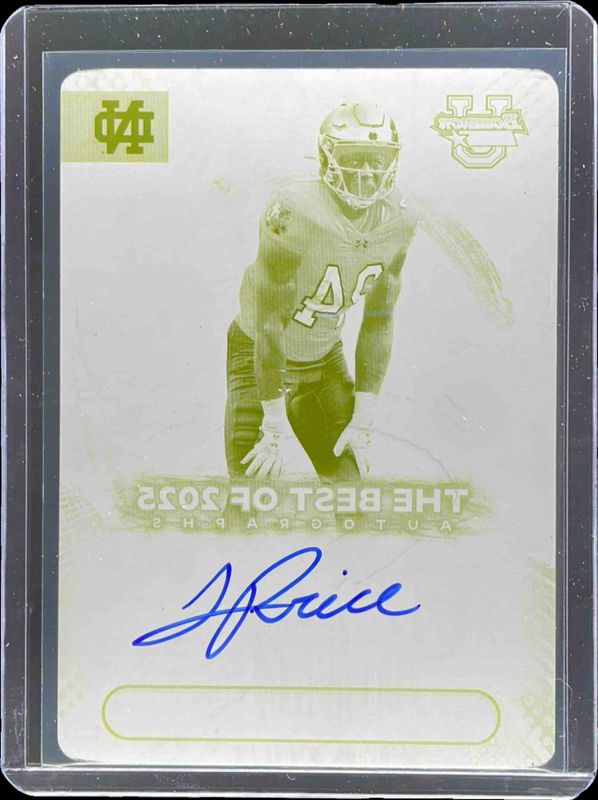 The Jadarian Price 2025 Bowman's Best #BOA-JPR The Best of 2025 Autographs - Printing Plates Yellow /1 card is 1 of 38 Jadarian Price's card variations in the 2025 Bowman's Best set being tracked by Sports Card Investor, including Base, Refractor, Shimmer Refractor, Yellow Lazer Refractor /250, and Aqua Lava Refractor /199.