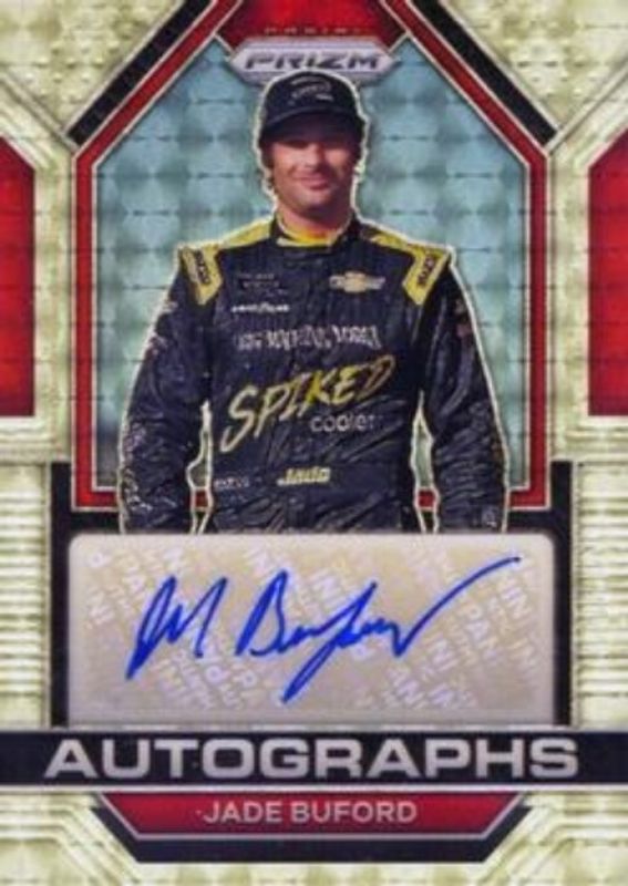 The Jade Buford 2023 Prizm NASCAR #A-JBF Autographs - Gold Vinyl /1 card is 1 of 7 Jade Buford's card variations in the 2023 Prizm NASCAR set being tracked by Sports Card Investor, including Autographs, Autographs - Checkered Flag /50, Autographs - Rainbow /24, Autographs - Gold /10, and Autographs - White /5.