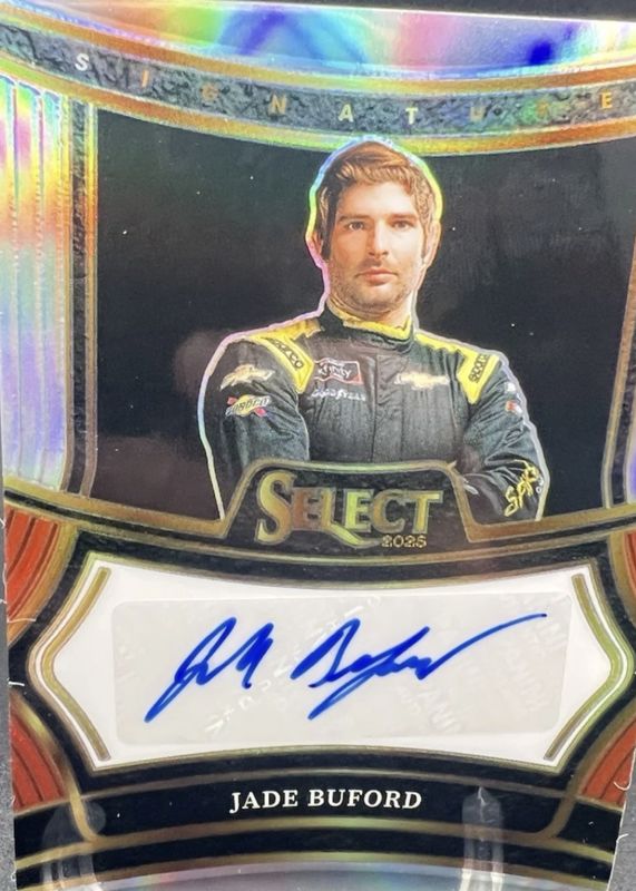 The Jade Buford 2025 Select NASCAR #S-JBD Signatures card is 1 of 10 Jade Buford's card variations in the 2025 Select NASCAR set being tracked by Sports Card Investor, including Signatures Flash, Signatures Ice, Signatures Blue /99, Signatures Purple /49, and Signatures Tie-Dye /25.
