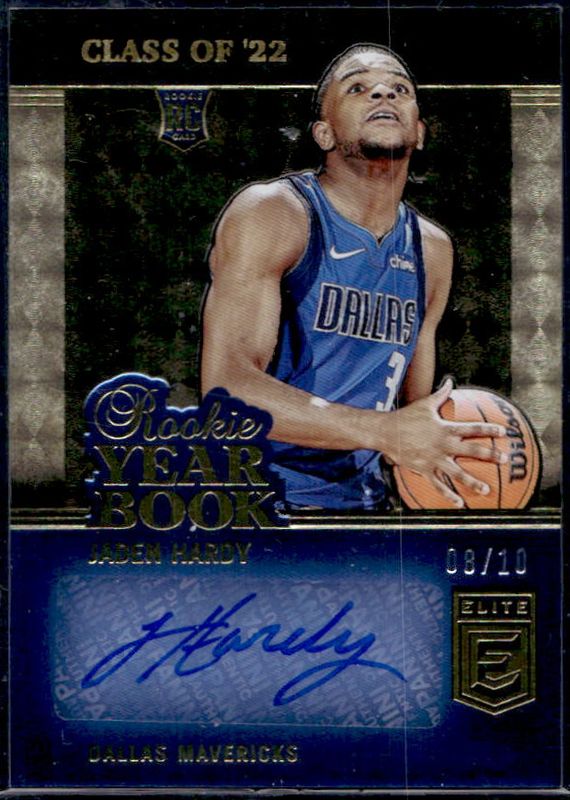 The Jaden Hardy 2022 Elite #RYB-JDH Rookie Yearbook Autographs - Gold /10 card is 1 of 34 Jaden Hardy's card variations in the 2022 Elite set being tracked by Sports Card Investor, including Base, Asia Exclusive, Asia Hyper Red & Green, Aspirations (/97), and Orange.