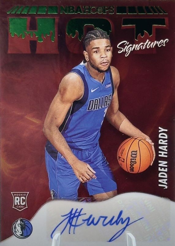 The Jaden Hardy 2022 Hoops #HSR-JDH Hot Signatures Rookies - Green card in Raw condition has not changed in price in the last 30 days and was last sold for $7.00 .