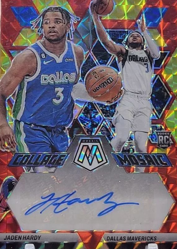 This card is 1 of 19 Jaden Hardy's card variations in the 2022 Mosaic set being tracked by Sports Card Investor, including Collage Autographs, Collage Autographs - Blue (/49), Collage Autographs - Red Wave, Fast Break Autographs, and Rookie Autographs.