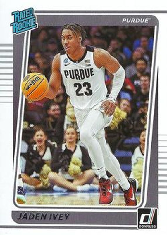 The Jaden Ivey 2022 Chronicles Draft Picks #12 Donruss Rated Rookie card is 1 of 215 Jaden Ivey's card variations in the 2022 Chronicles Draft Picks set being tracked by Sports Card Investor, including Base, Black, Bronze, Pink, and Pulsar.