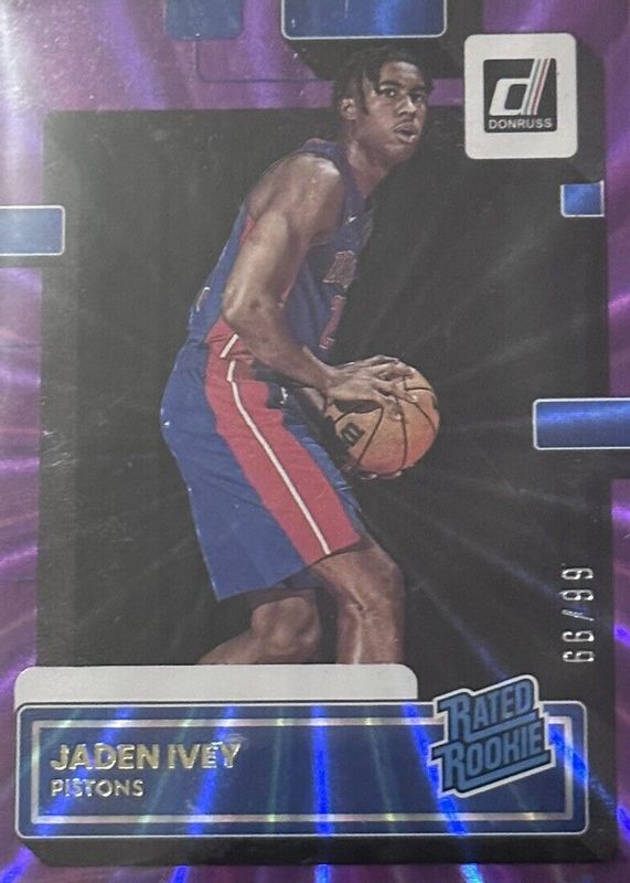The Jaden Ivey 2022 Donruss #205 Holo Purple Laser /99 Rookie card in Raw condition has not changed in price in the last 30 days and was last sold for $4.99 .