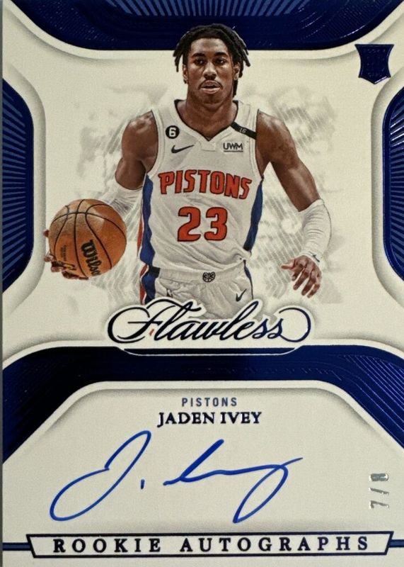 The Jaden Ivey 2022 Flawless #DA-JIV Distinguished Autographs - Blue /8 Rookie card in Raw condition has not changed in price in the last 30 days and was last sold for $210.00 .