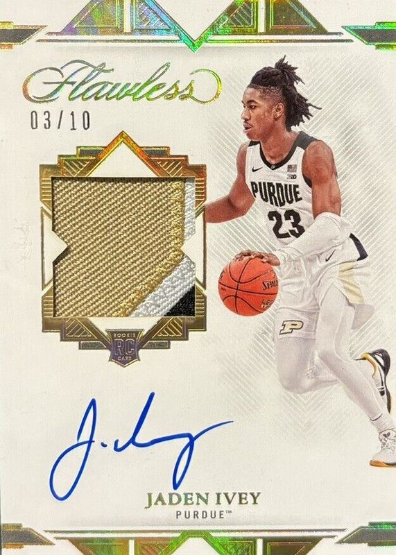 This card is 1 of 51 Jaden Ivey's card variations in the 2022 Flawless set being tracked by Sports Card Investor, including Star Swatch Signatures (/25), Distinguished Autographs /25, Flawless Patch Autographs /25, Horizontal Patch Autographs /25, and Momentous Autographs /25.