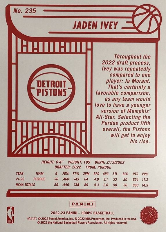 2022-23 PANINI NBA HOOPS RED BACK #235 JADEN IVEY RC