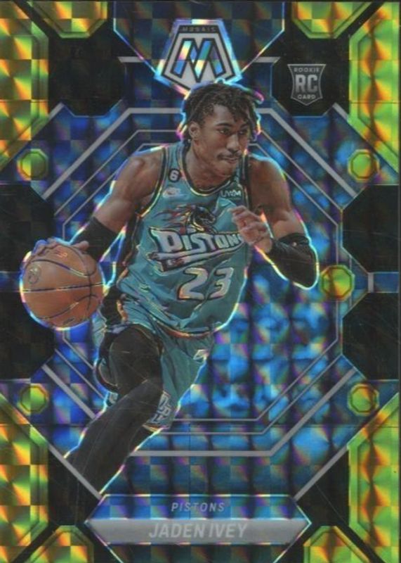 This card is 1 of 74 Jaden Ivey's card variations in the 2022 Mosaic set being tracked by Sports Card Investor, including Base, Blue Wave, Choice Red & Green, Fast Break, and Green.