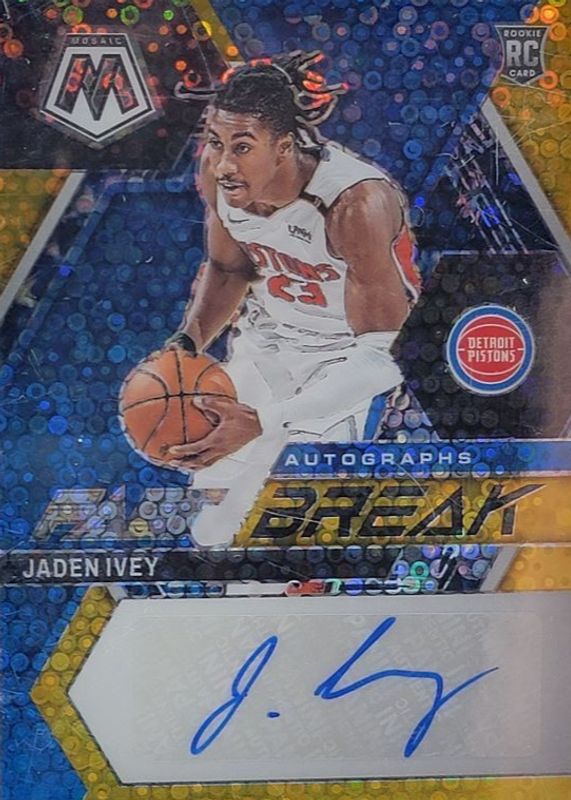 The Jaden Ivey 2022 Mosaic #FB-IVE Fast Break Autographs - Gold /10 Rookie card in Raw condition has not changed in price in the last 30 days and was last sold for $130.50 .