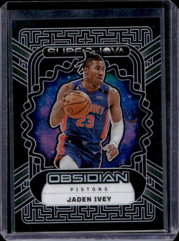 The Jaden Ivey 2022 Obsidian #9 Supernova /99 Rookie card is 1 of 96 Jaden Ivey's card variations in the 2022 Obsidian set being tracked by Sports Card Investor, including Electric Etch Asia, Electric Etch Neon Flood, Electric Etch Red Flood, Electric Etch White Pulsar, and Electric Etch Purple /75.