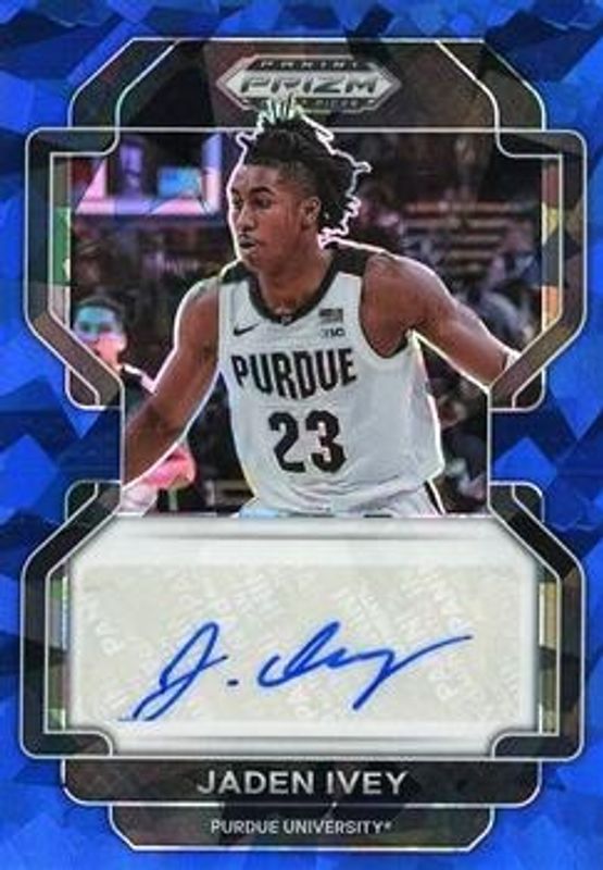 The Jaden Ivey 2022 Prizm Draft Picks #DP-JIV Draft Picks Autographs - Blue Ice /75 Rookie card is 1 of 159 Jaden Ivey's card variations in the 2022 Prizm Draft Picks set being tracked by Sports Card Investor, including #53 Base, #53b Base, #53 Blue Circles, #53 Choice Blue Yellow & Green, and #53b Choice Blue Yellow & Green.