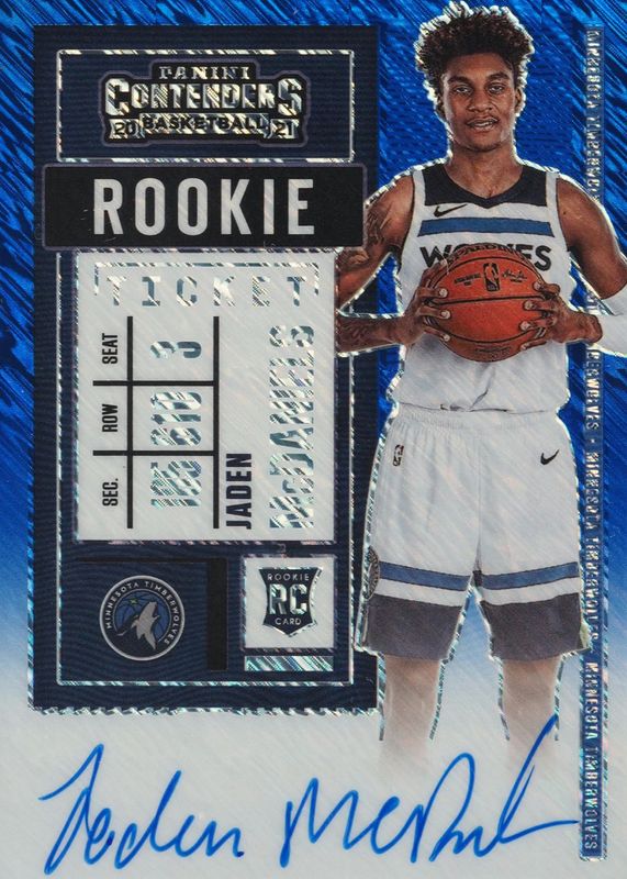 This card is 1 of 28 Jaden McDaniels' card variations in the 2020 Contenders set being tracked by Sports Card Investor, including Rookie Ticket Auto (Two Hands on Ball), Rookie Ticket Auto - Clear Ticket (Two Hands on Ball), Rookie Ticket Auto - Premium (Two Hands on Ball), Rookie Ticket Auto - Premium Green Shimmer (Two Hands on Ball), and Rookie Ticket Auto - Ticket Stub (/3 - Two Hands on Ball).