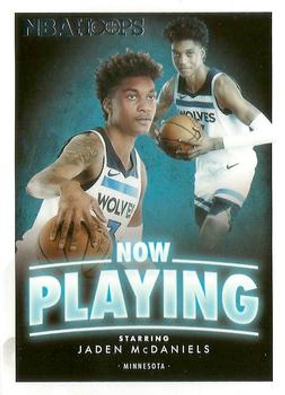 The Jaden McDaniels 2020 Hoops #SS-33 Now Playing Rookie card is 1 of 39 Jaden McDaniels' card variations in the 2020 Hoops set being tracked by Sports Card Investor, including Base, Blue, Hyper Blue, Neon Green, and Purple.