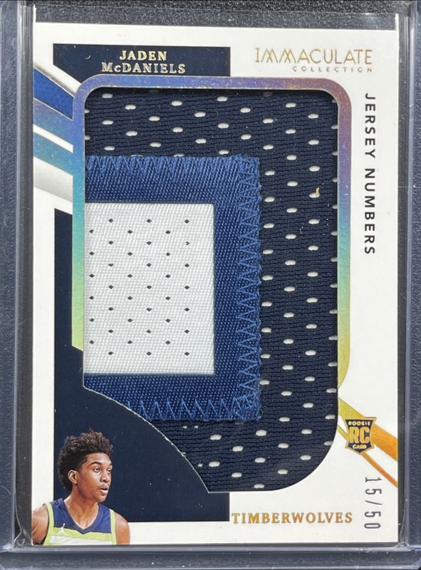 The Jaden McDaniels 2020 Immaculate #JP-JMD Jumbo Patches - Jersey Number /2 Rookie card is 1 of 34 Jaden McDaniels' card variations in the 2020 Immaculate set being tracked by Sports Card Investor, including Base /99, Red /49, Gold /10, Immaculate Rookie Introductions Autographs (/99), and Premium Patch Autographs (/50).