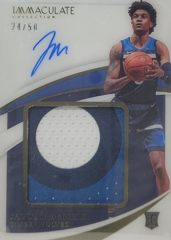 The Jaden McDaniels 2020 Immaculate #PPA-JAD Premium Patch Autographs (/50) Rookie card in Raw condition has not changed in price in the last 30 days and was last sold for $272.00 .