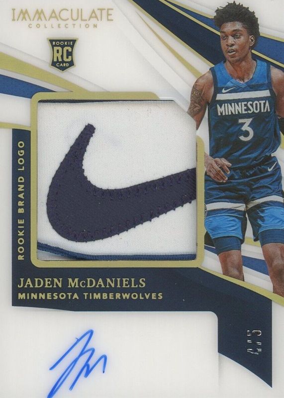 The Jaden McDaniels 2020 Immaculate #RBL-JAD Rookie Brand Logo Autographs /5 card in Raw condition has not changed in price in the last 30 days and was last sold for $1,026.00 .