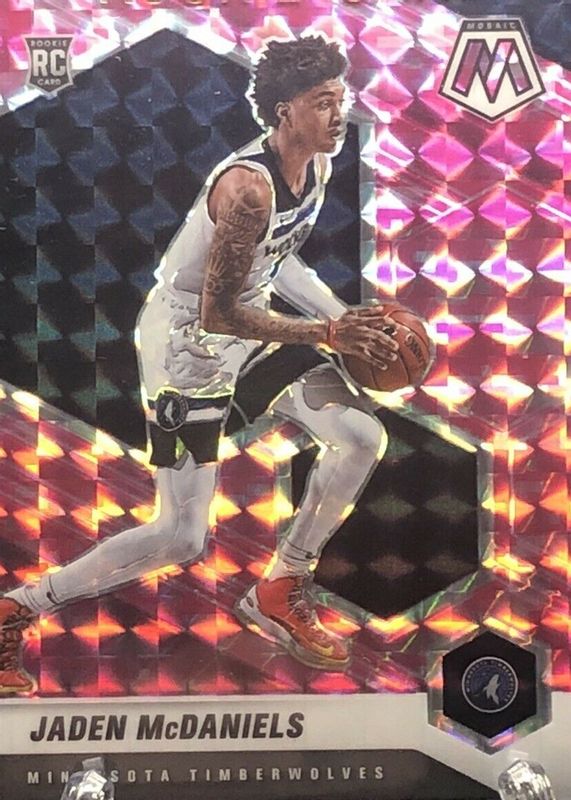 The Jaden McDaniels 2020 Mosaic #235 Pink Camo Rookie card in Raw condition has not changed in price in the last 30 days and was last sold for $0.99 .