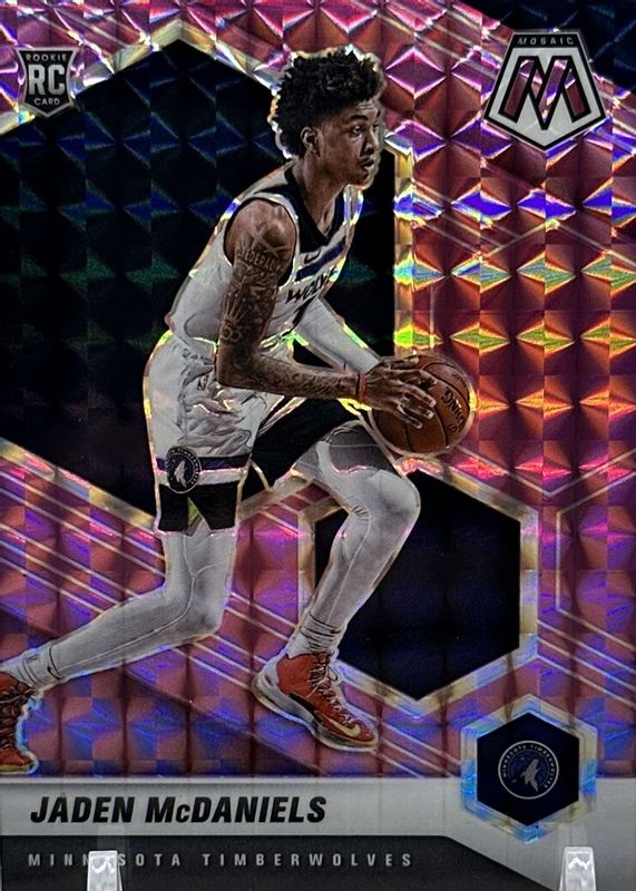 The Jaden McDaniels 2020 Mosaic #235 Purple /49 Rookie card in Raw condition has not changed in price in the last 30 days and was last sold for $46.54 .