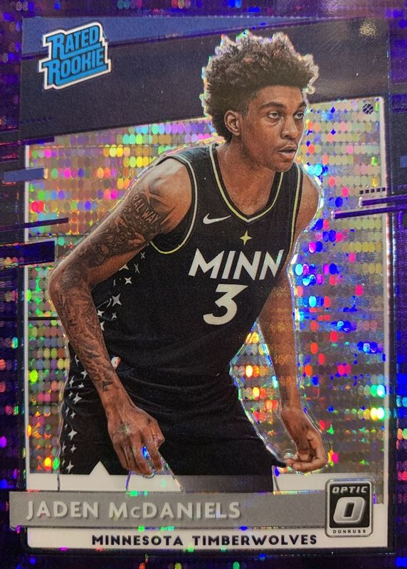 The Jaden McDaniels 2020 Optic #178 Purple Pulsar Rookie card in Raw condition has not changed in price in the last 30 days and was last sold for $2.62 .