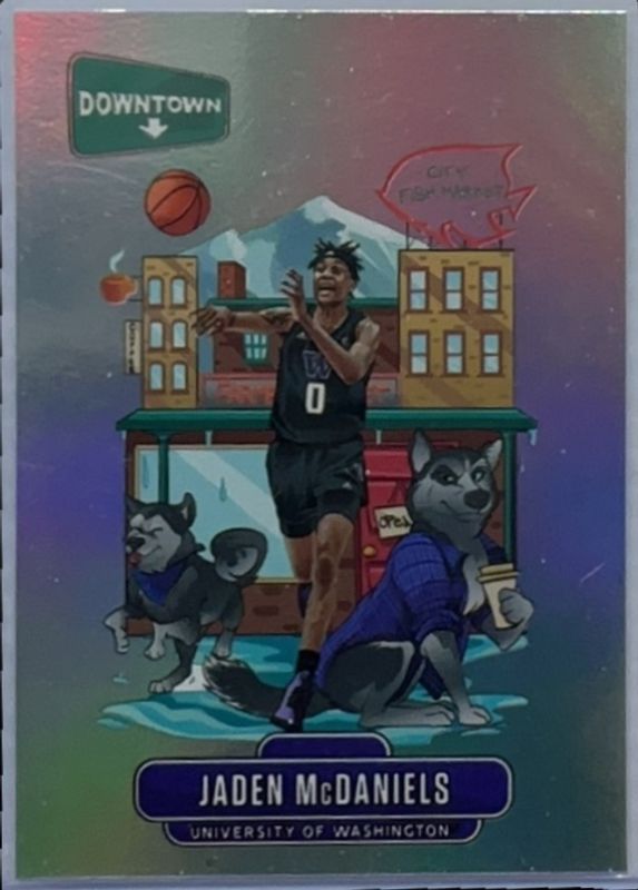 The Jaden McDaniels 2020 Prizm Draft Picks #D-9 Downtown /(SSP) Rookie card is 1 of 121 Jaden McDaniels' card variations in the 2020 Prizm Draft Picks set being tracked by Sports Card Investor, including #91 Base, #11 Base, #51 Base, #91 Choice Blue Yellow Green, and #11 Choice Blue Yellow Green.