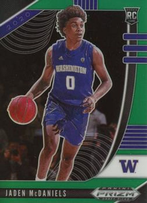 The Jaden McDaniels 2020 Prizm Draft Picks #51 Green Rookie card is 1 of 121 Jaden McDaniels' card variations in the 2020 Prizm Draft Picks set being tracked by Sports Card Investor, including #91 Base, #11 Base, #51 Base, #91 Choice Blue Yellow Green, and #11 Choice Blue Yellow Green.