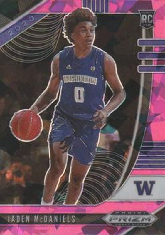 The Jaden McDaniels 2020 Prizm Draft Picks #51 Pink Ice Rookie card is 1 of 121 Jaden McDaniels' card variations in the 2020 Prizm Draft Picks set being tracked by Sports Card Investor, including #91 Base, #11 Base, #51 Base, #91 Choice Blue Yellow Green, and #11 Choice Blue Yellow Green.