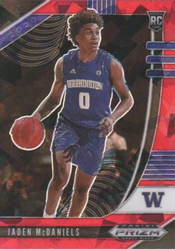The Jaden McDaniels 2020 Prizm Draft Picks #51 Red Ice Rookie card is 1 of 121 Jaden McDaniels' card variations in the 2020 Prizm Draft Picks set being tracked by Sports Card Investor, including #91 Base, #11 Base, #51 Base, #91 Choice Blue Yellow Green, and #11 Choice Blue Yellow Green.