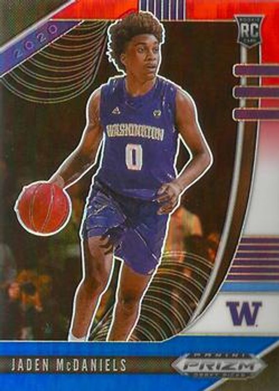 The Jaden McDaniels 2020 Prizm Draft Picks #51 Red White Blue Rookie card is 1 of 121 Jaden McDaniels' card variations in the 2020 Prizm Draft Picks set being tracked by Sports Card Investor, including #91 Base, #11 Base, #51 Base, #91 Choice Blue Yellow Green, and #11 Choice Blue Yellow Green.
