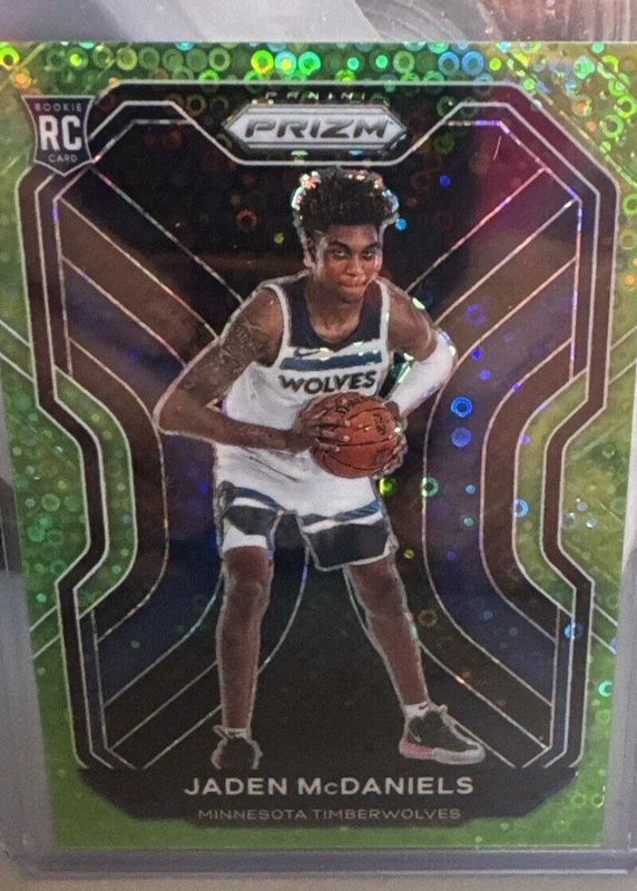 The Jaden McDaniels 2020 Prizm #277 Fast Break Neon Green /5 Rookie card in Raw condition has not changed in price in the last 30 days and was last sold for $375.00 .