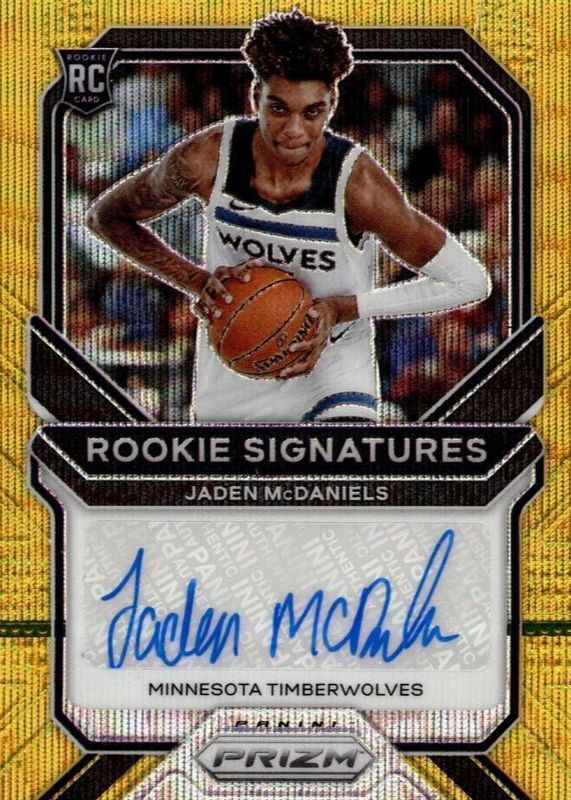 The Jaden McDaniels 2020 Prizm #RP-JMD Rookie Penmanship - Gold Wave card in Raw condition has not changed in price in the last 30 days and was last sold for $186.50 .