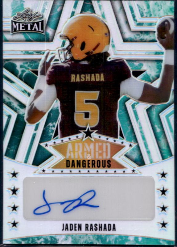 The Jaden Rashada 2024 Leaf Metal #AD-JR1 Armed & Dangerous Autographs Prismatic Water /5 card is 1 of 292 Jaden Rashada's card variations in the 2024 Leaf Metal set being tracked by Sports Card Investor, including Autographs Pulsar Sky Pre Production Proofs, Prismatic Silver, Mojo Silver /10, Pulsar Silver /10, and Crystal Silver /8.
