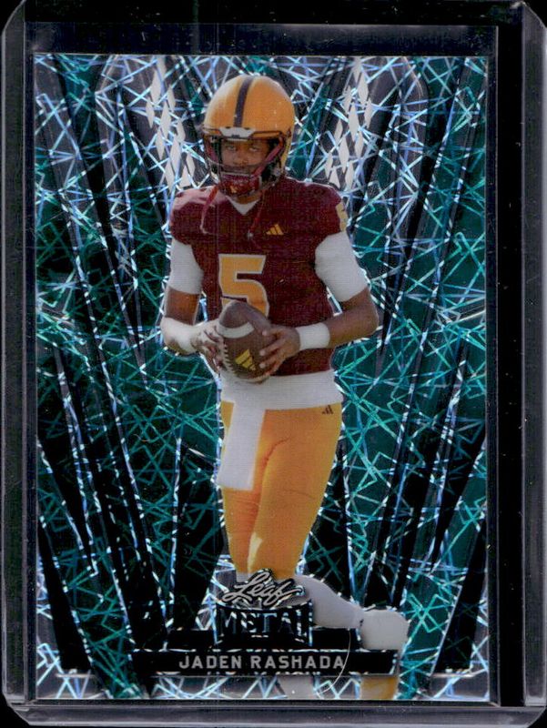 The Jaden Rashada 2024 Leaf Metal #50 Laser Water /1 card is 1 of 292 Jaden Rashada's card variations in the 2024 Leaf Metal set being tracked by Sports Card Investor, including Autographs Pulsar Sky Pre Production Proofs, Prismatic Silver, Mojo Silver /10, Pulsar Silver /10, and Crystal Silver /8.
