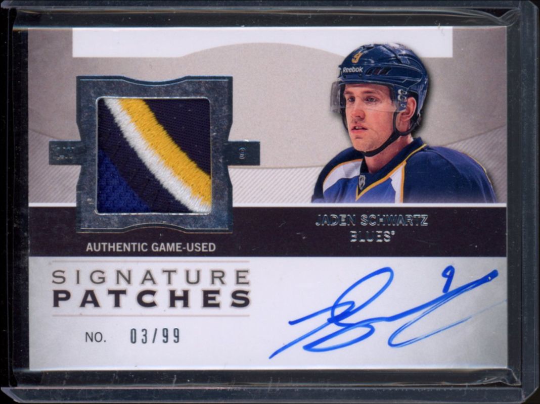 The Jaden Schwartz 2012 Upper Deck The Cup #SP-SC Signatures Patches /99 Rookie card is 1 of 72 Jaden Schwartz's card variations in the 2012 Upper Deck The Cup set being tracked by Sports Card Investor, including Base /249, Gold /25, Gold Rainbow /10, Black /1, and Black Laundry Tags /1.
