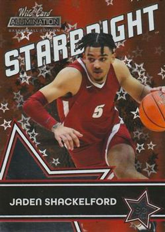 The Jaden Shackelford 2021 Wild Card Alumination #SB-10 Starbright Red card is 1 of 430 Jaden Shackelford's card variations in the 2021 Wild Card Alumination set being tracked by Sports Card Investor, including Base, 100 Stripe, 10 Stripe, 20 Stripe, and 50 Stripe.