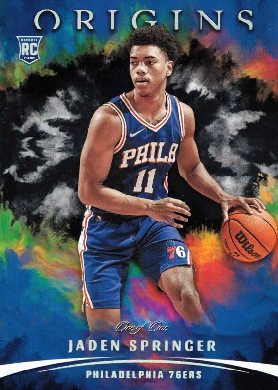 This card is 1 of 11 Jaden Springer's card variations in the 2021 Origins set being tracked by Sports Card Investor, including Base, Red, Blue /99, Orange /75, and Pink /60.