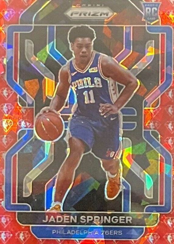This card is 1 of 63 Jaden Springer's card variations in the 2021 Prizm set being tracked by Sports Card Investor, including Base, Blue NBA 75th Anniversary, Blue Wave, Choice Blue Yellow Green, and Factory Set Blue Hyper.