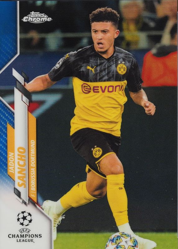 The Jadon Sancho 2019 Topps Chrome UEFA Champions League #16 Blue Refractor /150 card in Raw condition has not changed in price in the last 30 days and was last sold for $1.25 .