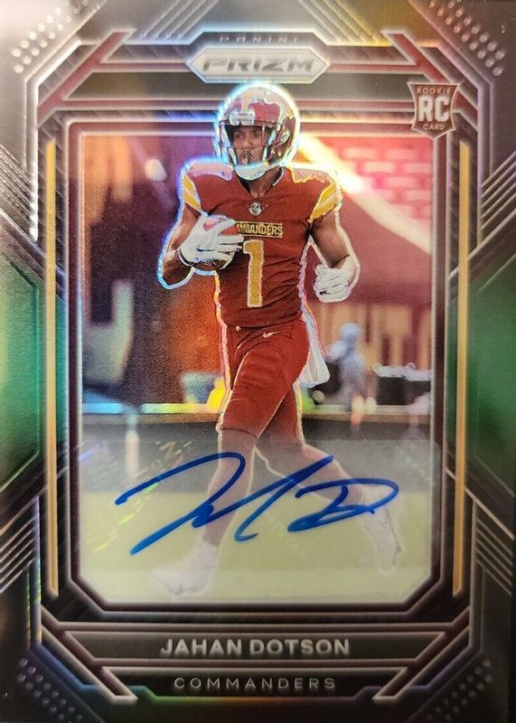 The Jahan Dotson 2022 Chronicles #PB-15 Prizm Black Signatures - Green (/49) Rookie card in Raw condition has not changed in price in the last 30 days and was last sold for $12.50 .
