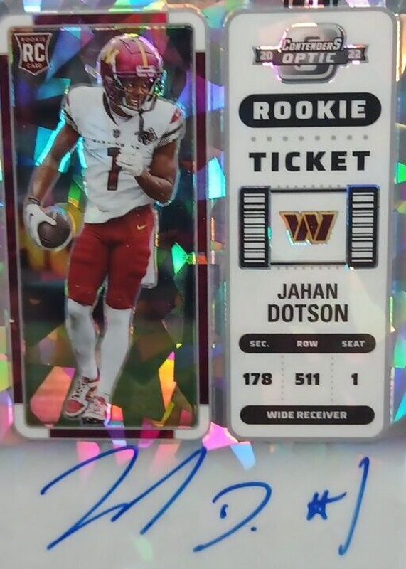 The Jahan Dotson 2022 Contenders Optic #121 Rookie Ticket Auto - Cracked Ice Ticket /22 card in Raw condition has not changed in price in the last 30 days and was last sold for $77.00 .